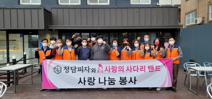 청담피자 최종인 대표는 “오늘 사랑의 사다리 밴드 봉사단체와 업무협약식을 계기로 지역의 어려운 이웃을 위해서 따뜻한 사랑을 주기적으로 실천 하겠다.”고 말했다.