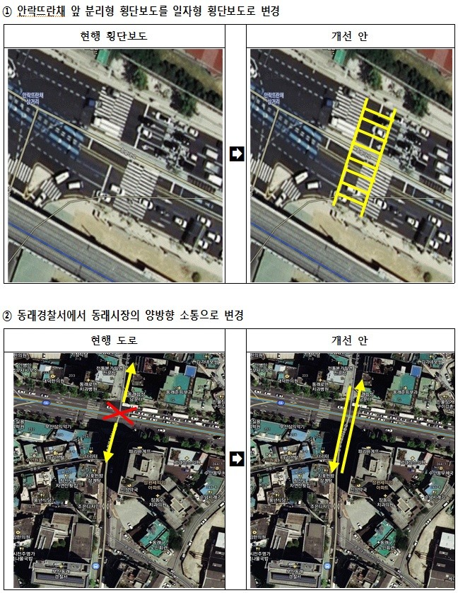 그 결과 도로와 인도의 폭이 좁은 상태에서 버스 등 대형차량의 진입과 불법 주정차 등으로 인해 발생할 문제점 등을 고려하면 동래경찰서에서 동래구청까지의 도로의 양방향은 장기적인 과제로 남겨두고 동래경찰서에서 동래시장의 도로에 대한 양방향 도로로의 전환에 대한 기술적인 검토를 추진하기로 했다. 현재 동래경찰서 앞 2차선 일방도로를 3차선으로 넓혀 양방향 소통이 가능한지, 동래경찰서에서 동래시장 쪽으로 직진신호를 주는 것이 가능한지 등에 대한 기술적인 검토가 주 내용이다.