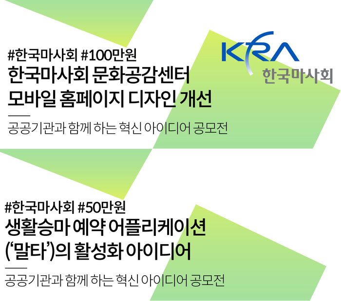 [세계타임즈 심귀영 기자]한국마사회(회장 김우남)은 지난 18일부터 오는 5월 26일까지 ‘공공기관과 함께 하는 혁신 아이디어 공모전’을 통해 서비스 및 디자인 공모를 실시한다.
