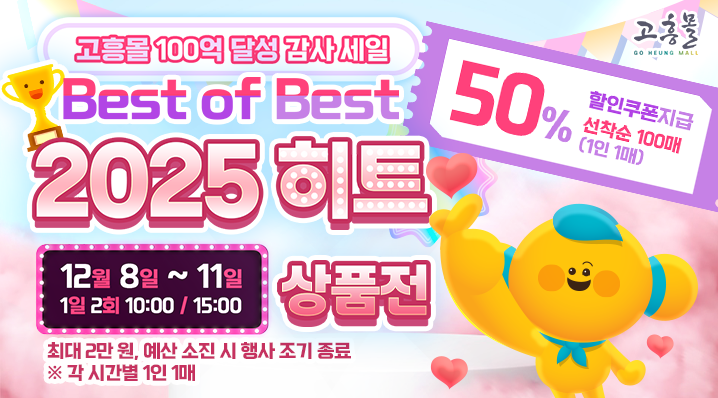 [고흥군 세계타임즈=우덕현 기자] 고흥군(군수 공영민)은 직영 온라인 농수축특산물 쇼핑몰 ‘고흥몰’이 누적 매출 100억 원 돌파를 기념해 오는 1월 8일부터 11일까지 ‘100억 달성 감사 세일–2025 Best of Best’ 기획전을 진행한다고 밝혔다.
