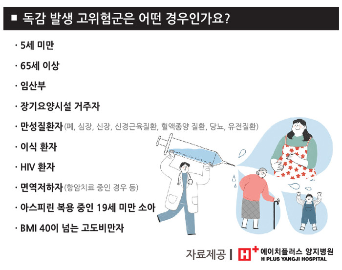 독감 발생 고위험군으로는 5세미만 영유아, 65세 이상 어르신과 임산부, 장기요양시설 거주자와 만성질환자, 이식환자, HIV 환자, 면역저하자, 아스피린 복용 중인 19세 미만 소아청소년, BMI 지수 40 이상인 고도비만자 등으로 예방관리를 철저히 해야 한다.