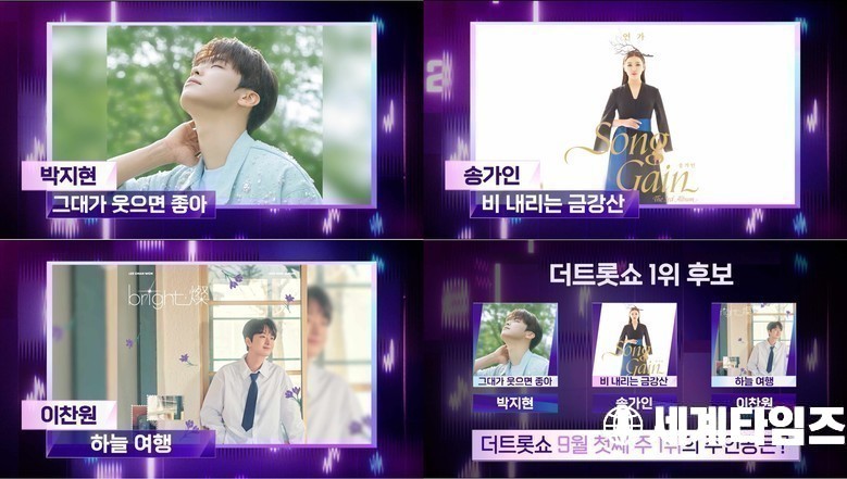 1위 후보곡은 많은 이들에게 엔돌핀을 선사하며 2주 연속 1위를 차지한 박지현의 ‘그대가 웃으면 좋아’와 짙은 감정과 애절한 보이스로 대중들의 마음을 사로잡은 송가인의 ‘비 내리는 금강산’, 발매 이후 꾸준한 사랑을 받으며 다시 한번 1위 후보에 오른 이찬원의 ‘하늘 여행’이 선정됐다.