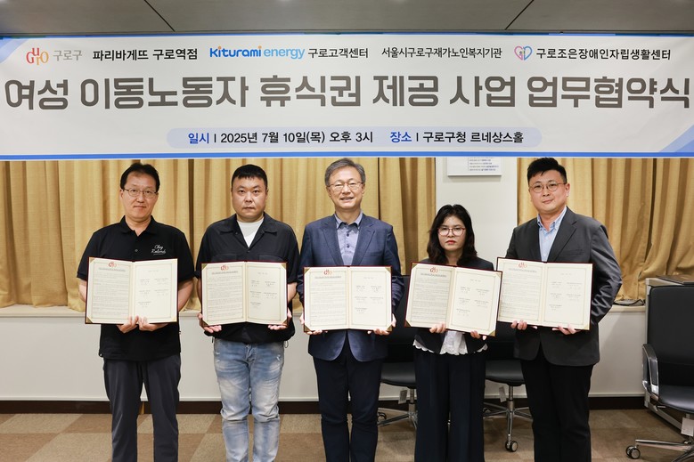이번 협약은 이들의 휴식권 보장과 근무 여건 개선을 위해 마련됐으며, 구로구와 파리바게뜨 구로역점, 귀뚜라미에너지 구로고객센터, 서울시구로구재가노인복지기관, 구로조은장애인자립생활센터가 함께 참여했다.