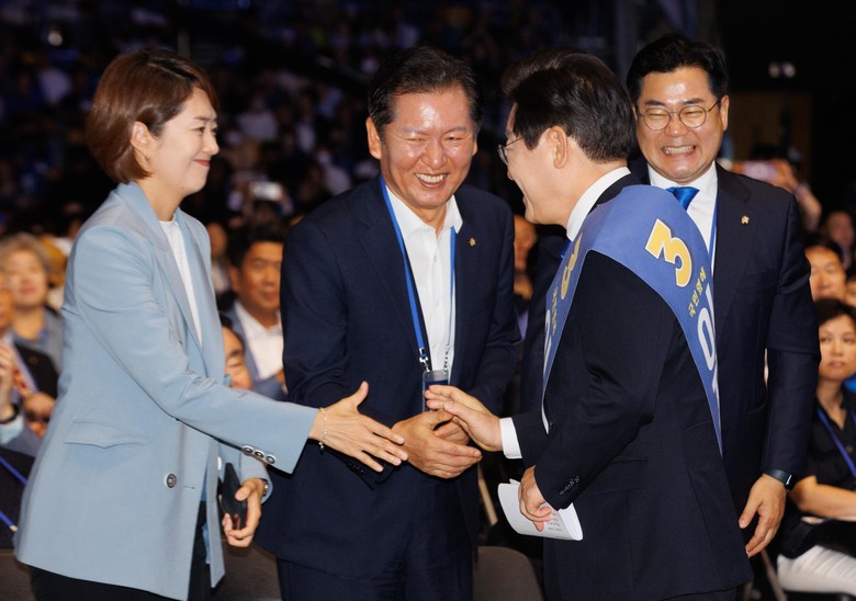 민주당 정청래-고민정 최고위원과 인사하는 이재명 대표 후보