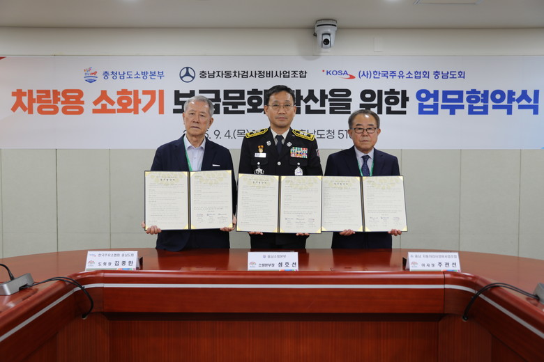 특히 충남소방본부는 차량용 소화기 보급 문화 확산을 위한 정책적 지원과 차량 화재 예방 홍보를 주도하고, 한국주유소협회 충남도회와 충남자동차검사정비사업조합은 소속 업체를 통해 차량용 소화기 판매와 비치 안내를 적극 추진하기로 했다.