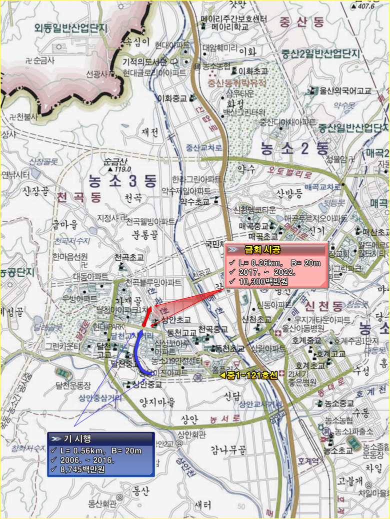 한편, ‘달천현대I'park ~ 천곡천 간(중1-121) 도로개설’ 사업규모는 L=0.26km, B=20m이며, 2024년 말 공사가 완료될 예정이다.