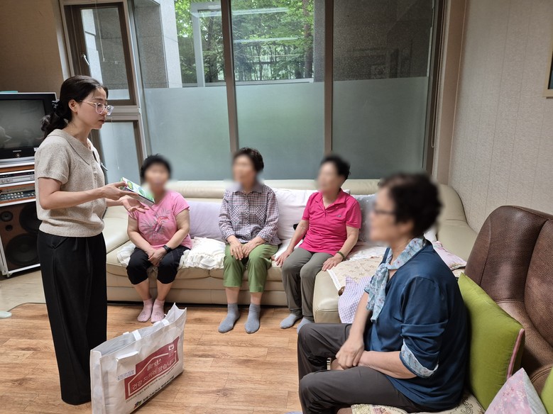 | ▲ 경로당 어르신에게 쿨링 팔토시 등 폭염 대비 물품을 전달하는 모습 |
