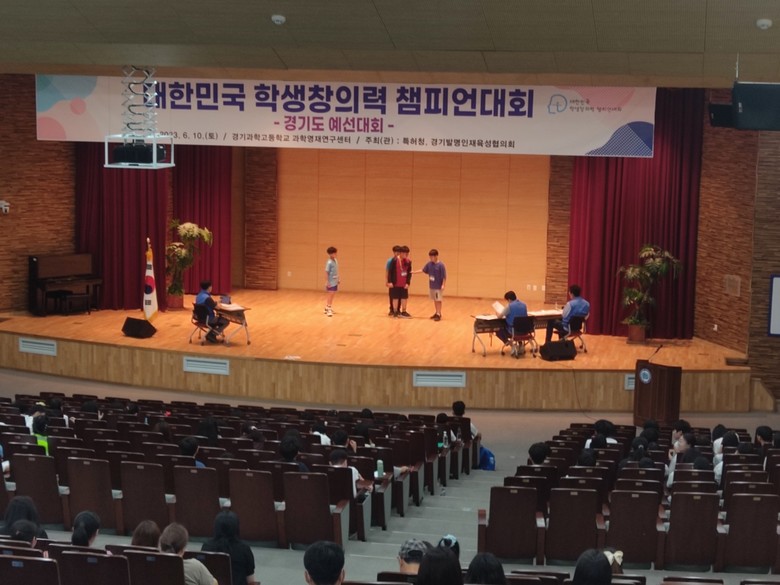 2023 대한민국 학생창의력챔피언대회는 우수 창의인재 양성을 위해 특허청에서 주최하고 한국발명진흥회에서 주관하는 대회로 6월 10일(토)에 경기도과학고등학교 과학영재연구센터(수원)에서 경기도 예선 대회를 진행하였다.