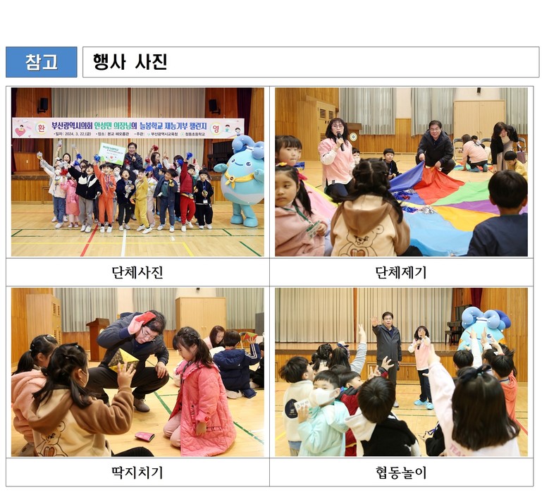 안 의장은 부산의 저출생 문제를 최우선 의정과제로 생각하며, 평소 돌봄의 사회적 책임 확대 및 공공성을 통한 선진도시 부산을 꾸준히 강조해왔다. 이번 재능기부는 이러한 노력의 하나로 안 의장은 늘봄교실을 이용하는 20여 명의 1학년 학생들과 ‘단체 제기, 딱지치기’와 같은 전통놀이와 손을 마주잡으며‘우리 집에 왜 왔니’협동 놀이를 했다.