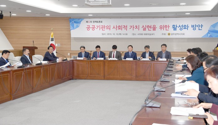10일 시의회 4층 대회의실에서는 조석호 의원이 좌장을 맡고, 김기곤(광주·전남연구원 사회환경연구실장), 조선익(참여자치21 공동대표), 박광진(광주도시공사 혁신인권팀장), 김형민(광주도시철도공사 기획조정처장) 이승규(광주광역시 혁신정책관실 혁신정책담당) 등이 발제하고 토론자로 나선 가운데 ‘공공기관의 사회적 가치 실현 활성화 방안’ 토론회를 가졌다.