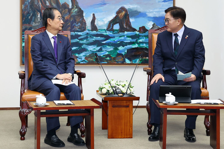 [세계타임즈 = 이채봉 기자] 한덕수 대통령 권한대행 국무총리와 우원식 국회의장이 15일 국회에서 만나고 있다. 2024.12.15 [대통령실통신사진기자단]