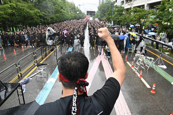 이날 오전 11시부터 경기 화성시 삼성전자 화성사업장 H1 정문 앞에서 진행된 결의대회에는 장맛비에도 불구하고 기흥, 평택, 천안, 온양, 구미, 광주사업장 등에서 노조 추산 6000여 명이 참여했다.