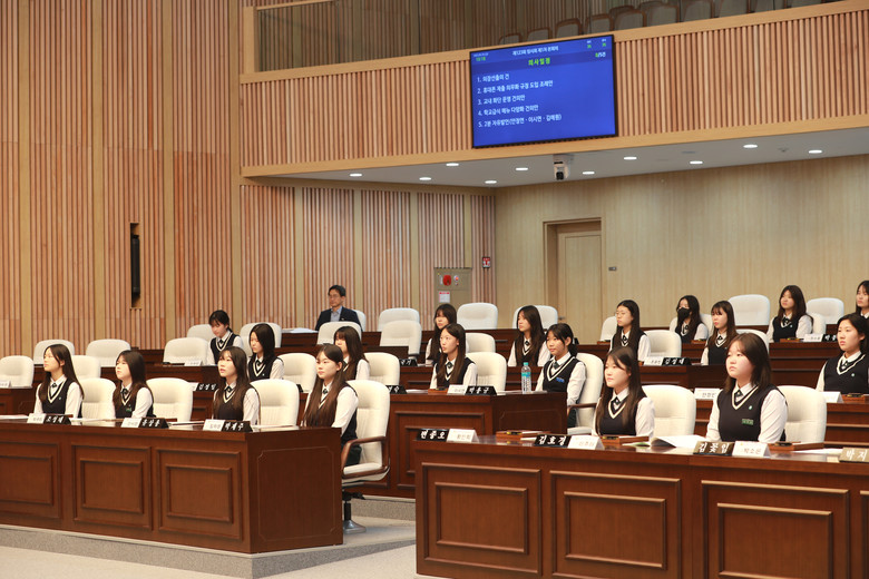 예성여중 학생들은 ‘휴대폰 제출 의무화 규정 도입 조례안’과 ‘교내 화단 운영 건의안’, ‘학교급식 메뉴 다양화 도입 건의안’ 등 3건의 안건을 심의‧의결했다.