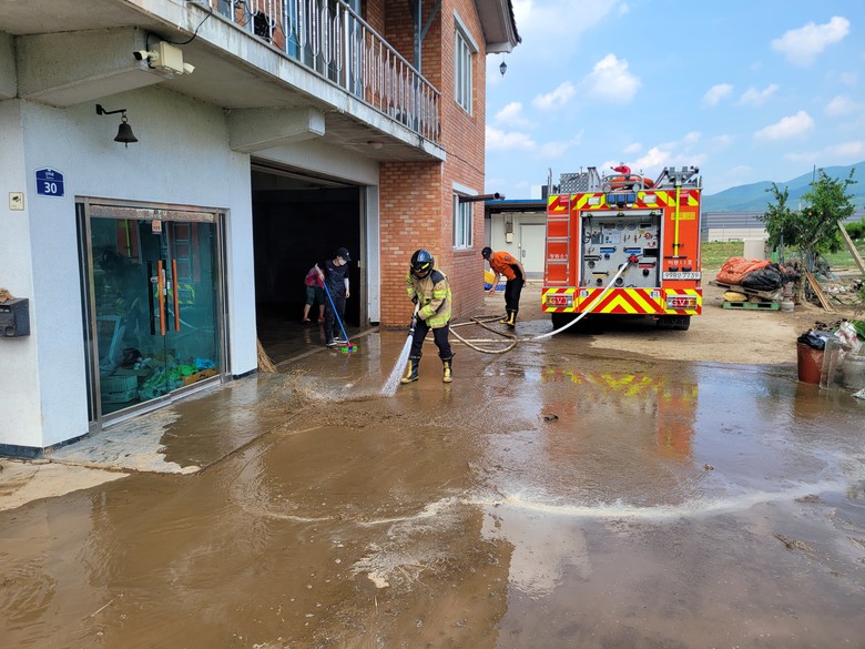 먼저, 산청군 내 수해 피해가 지역에 신속한 복구 작업 지원을 위해 소방차량 17대를 운용하고, 그중 9대를 복구 지원 전용 소방차량으로 지정하여 긴급 투입했다. 투입된 소방차량은 침수 주택과 도로 정비, 농경지 토사 제거 등 실제 복구 작업이 필요한 현장 중심으로 운용되고 있다.