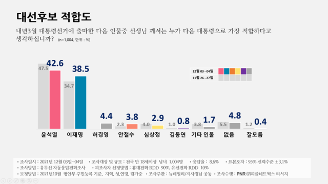 이는 지난 11월 25일 여론조사전문기관 아시아리서치앤컨설팅에서 실시한 여론조사결과, 본선 가상대결에서 허경영 후보가 4.7%를 기록한 데 이어 3위를 굳히는 양상으로 윤석열 국민의힘 후보 이재명 더불어민주당 후보 2강과 허경영 국가혁명당 후보 1중으로 안철수, 심상정, 김동연 등 3약 구도가 형성된 것으로 보여진다.