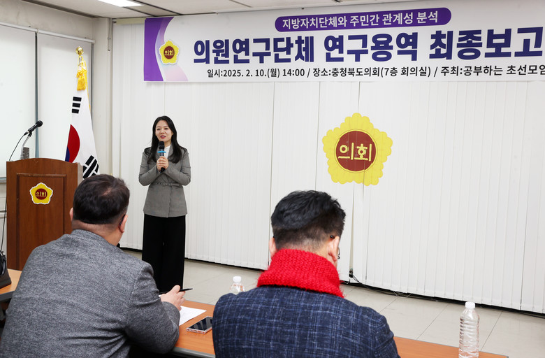 [충북 세계타임즈=이현진 기자] 충북도의회 연구단체인 ‘공부하는 초선모임(대표 안지윤 의원)’은 10일 도의회 회의실에서 소속 의원과 연구수행기관, 홍보부서 공무원 등이 참석한 가운데 연구용역 최종 보고회를 개최했다.