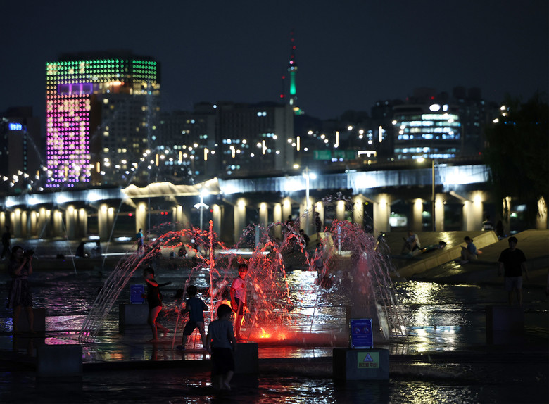 서울에 최장 열대야를 기록한 가운데 16일 서울 영등포구 여의도한강공원 물빛광장에서 시민들이 더위를 식히고 있다. 2024.8.16