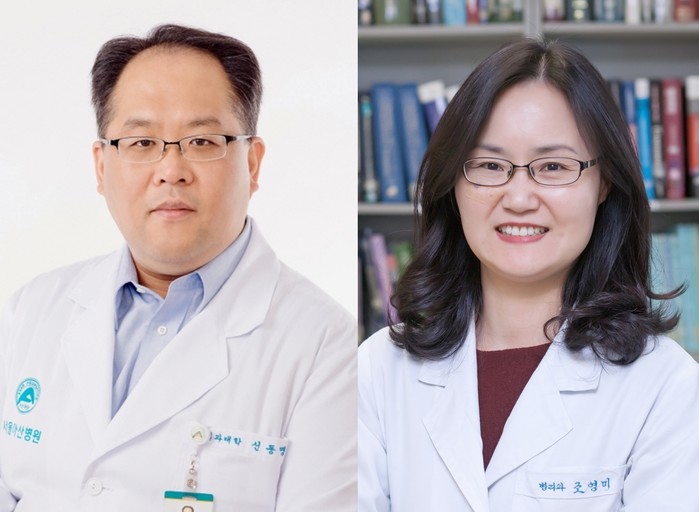 | ▲울산의대 의생명과학교실 신동명 교수(사진 왼쪽)와 서울아산병원 병리과 조영미 교수 |