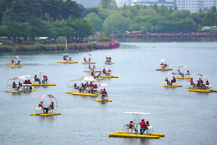 5일, 완연한 봄 날씨 속에 ‘2019고양국제꽃박람회’를 찾은 관람객들이 시원한 호수 위에서 ‘꽃 자전거 체험’을 하며 평화로운 시간을 보내고 있다. 5일과 6일 연휴동안 신나는 댄스뮤지컬(‘사랑하면 춤을 춰라’)이 꽃향기 무대에서 흥겨운 공연을 펼치고, 호수 위에서는 플라이 보드가 묘기를 부리며 색다른 볼거리를 선사한다. 행사장 곳곳에서는 캐릭터 인형, 마임, 저글링 등 다양한 거리 이벤트가 이어진다.
