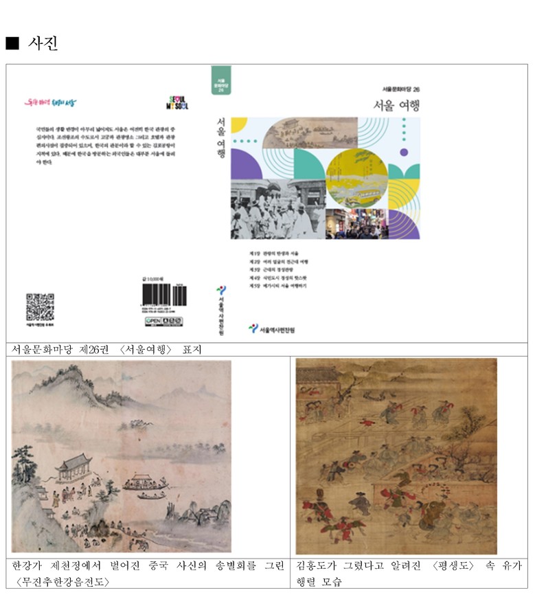 - 한강 유람, 북한산 등반 등 조선시대 풍류문화부터 오늘날의 한류관광까지 폭넓게 조명 - 서울공공도서관, 서울책방, 서울역사편찬원 누리집에서 열람 및 구매 가능 [서울 세계타임즈=이장성 기자] 서울역사편찬원(원장 이상배)이 서울문화마당 제26권 <서울여행>을 발간했다. ‘서울문화마당’ 시리즈는 서울역사편찬원이 서울의 각종 문화와 역사, 그에 따른 시민들의 삶을 읽기 쉽고 재미있게 소개하고 있는 시리즈다.