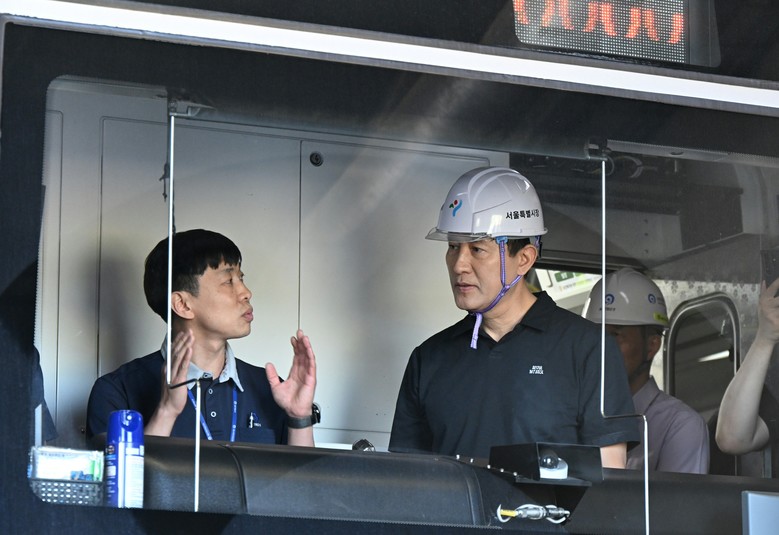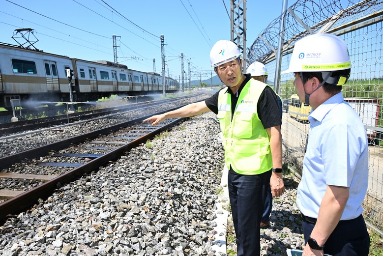 오 시장은 9호선 운영 현황과 폭염 대비 대책을 청취한 뒤 전동차에 올라 열차 내 혼잡도를 감지해 냉방 강도를 자동으로 조정하는 '자동냉방제어시스템'을 살폈다. 이어 열차가 드나드는 입출고선으로 이동해 폭염 시 스프링클러로 물을 분사(10~17시), 선로 열을 내려주는 ‘레일 자동 살수설비’도 점검했다.
