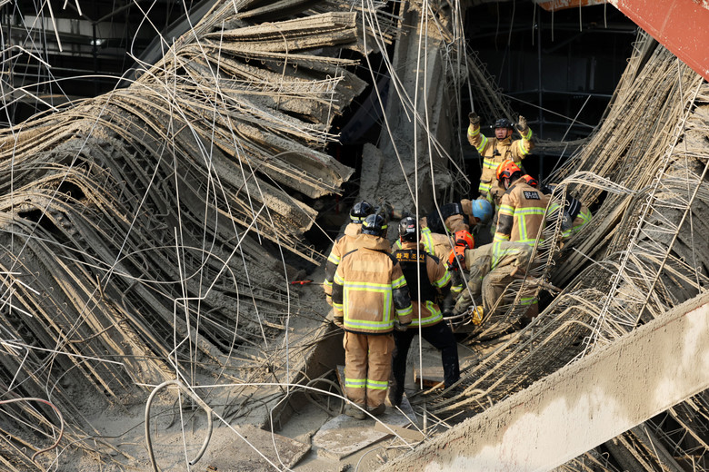 무거운 철골 구조물을 크레인으로 들어올려야 해 구조와 수색에 어려움을 겪고 있는 것으로 알려졌다.붕괴 사고는 콘크리트를 타설하고 있던 2층 옥상에서 시작된 것으로 파악됐다.건물과 건물 사이를 잇는 형태로 기둥과 기둥 사이 거리는 48m, 폭 20m가량으로 2층 옥상에서 지하층까지 연쇄 붕괴한 것으로 알려졌다.공사 과정에서 하중을 지지할 수 있는 동바리 등 지지대는 설치되지 않은 것으로 파악됐다.이와 관련해 공사현장 관계자는 "(지지대 없이 공사를 할 수 있는) 특허로 인해 공사를 진행했다"고 설명했다.