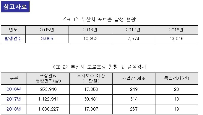 부산시는 한해 평균 도로복구비용 66억원, 도로포장 유지보수 220억원 등 약 300억원의 예산을 도로보수를 위해 투입하고 있지만 포트홀 발생 건수는 2015년 9,055건에서 2018년 13,016건으로 오히려 매년 증가하고 있는 추세를 보이고 있다.