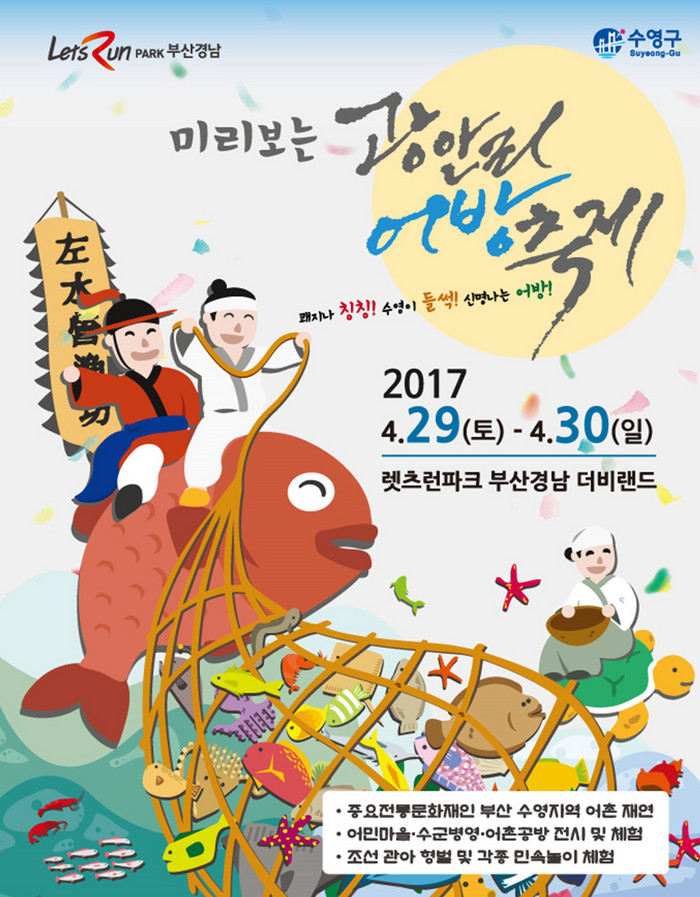 오는 4월 29일(토)에서 30일(일) 2일간 렛츠런파크 부산경남 더비랜드 일원에서 열리는 이번 축제는 ‘광안리어방축제’의 대표 콘텐츠인 ‘수군병영’, '어촌공방‘, ’어민마을‘ 등 다양한 프로그램을 선보인다.