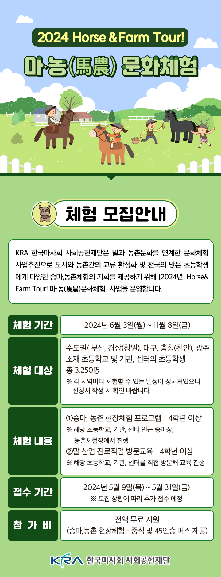 [세계타임즈 = 송민수 기자] 한국마사회 사회공헌재단(이사장 정기환)은 올해 말과 함께하는 농촌체험 사회공헌 사업인 ‘Horse & Farm Tour! 마·농(馬·農) 문화체험’을 전국으로 확대 시행한다고 밝혔다. 전액 무상으로 진행되는 마·농 문화체험은 전국의 초등학교와 아동센터 등을 대상으로 하며 5월 9일부터 5월 31일까지 스쿨김영사 홈페이지를 통해 신청할 수 있다.