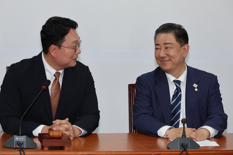 [세계타임즈 = 신상철 기자] 더불어민주당 김병기 당대표 직무대행 겸 원내대표(오른쪽)가 18일 서울 여의도 국회에서 개혁신당을 예방해 천하람 원내대표와 대화하고 있다. 2025.6.18