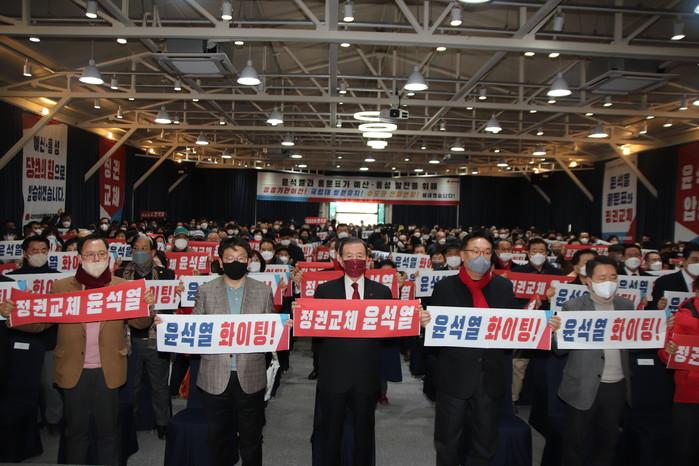 대선을 한달여 앞두고 윤석열 대선 후보의 승리를 결의하기 위해 마련된 이번 행사는 코로나19 방역수칙을 준수하기 위해 백신접종 완료자만을 참석 대상으로 한 가운데 방역치침을 준수하며 800여명의 당원이 참석했으나 방역법상 행사장내에는 300여명만이 입장할 수밖에 없어 많은 당원들이 발길을 돌릴 정도로 정권교체의 강한 열망을 확인할 수 있었다.