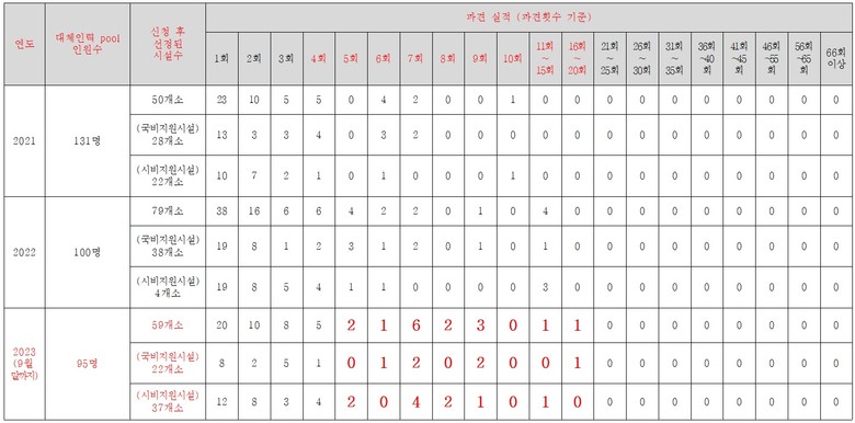 아울러, “보건복지부 지침(대체인력 지원사업)에 의하면, 대체인력 파견요청이 없는 유휴기간에는 파견 우선순위에 따른 시설에 순환근무를 하도록 되어 있음에도, 본 의원이 확인해본바 순환근무 파견시설에 대한 그 어떠한 기준이나 우선순위도 마련되어 있지 않다.”라고 지적하였다.