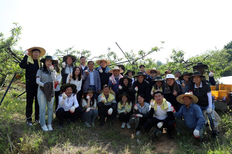 봉사활동 참가자들은 복숭아 농장주의 지도 아래 복숭아 품질 향상을 위한 꽃 솎는 작업에 구슬땀을 흘렸다.