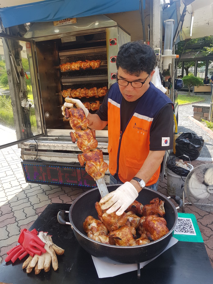 신상일 통닭 봉사 단장은 “주말에 아이들이 뜨끈뜨끈한 바비큐 통닭을 맛있게 먹고 건강하게 자라길 바란다.”고 말했다.