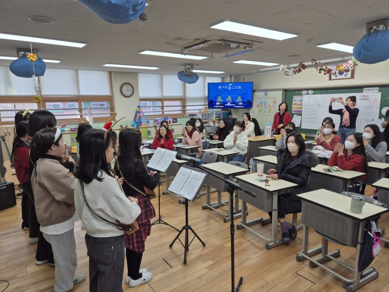 [파주시 세계타임즈=송민수 기자] 한가람초(교장 이강수)는 지난 12월 19일(목) 오후 3시에 5학년 2반 교실에서 교사 기타동아리 선생님들의 작은 공연이 열렸다. 이번 공연은 학생과 선생님들에게 음악의 즐거움을 전달하고, 교사와 학생 간의 소통을 증진하기 위해 마련되었다.