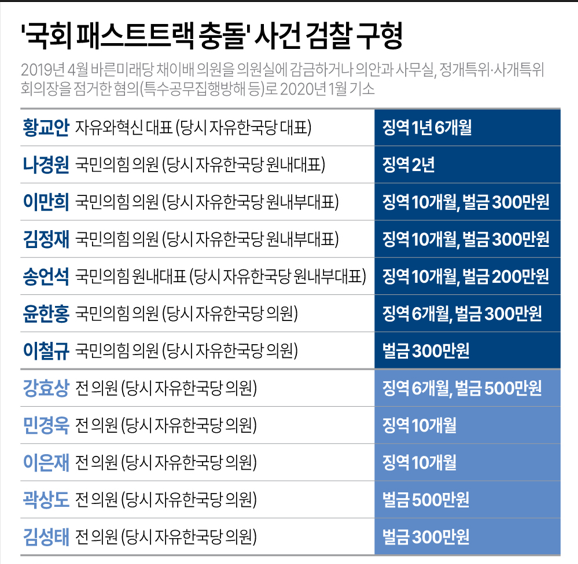 이만희·김정재 의원에게는 징역 10개월과 벌금 300만원을, 윤한홍 의원에게는 징역 6개월 및 벌금 300만원을, 이철규 의원에게는 벌금 300만원을 각각 선고해 달라고 재판부에 요청했다.이 밖에 원외인사들에게는 징역 10개월(민경욱·이은재 전 의원 등)부터 벌금 300만원(김성태 전 의원 등)이 구형됐다.검찰은 "범행 가담 정도 등을 고려해 이처럼 선고해주기를 바란다"고 밝혔다.이들을 비롯한 당시 국회의원과 보좌진 등 27명은 2019년 4월 바른미래당 채이배 의원을 의원실에 감금하거나 의안과 사무실, 정개특위·사개특위 회의장을 점거한 혐의(특수공무집행방해 등)로 2020년 1월 기소됐다.이날 구형은 재판이 시작된 지 5년 8개월여만에 이뤄진 것이다. 피고인 중 고(故) 장제원 전 의원은 사망을 이유로 공소가 기각됐다.오전에 열린 피고인 신문에서 나 의원은 패스트트랙 충돌이 국회선진화법에서 금지하는 폭력 행위가 아니라 기본적이고 일상적인 정치 행위였다며 혐의를 부인했다.