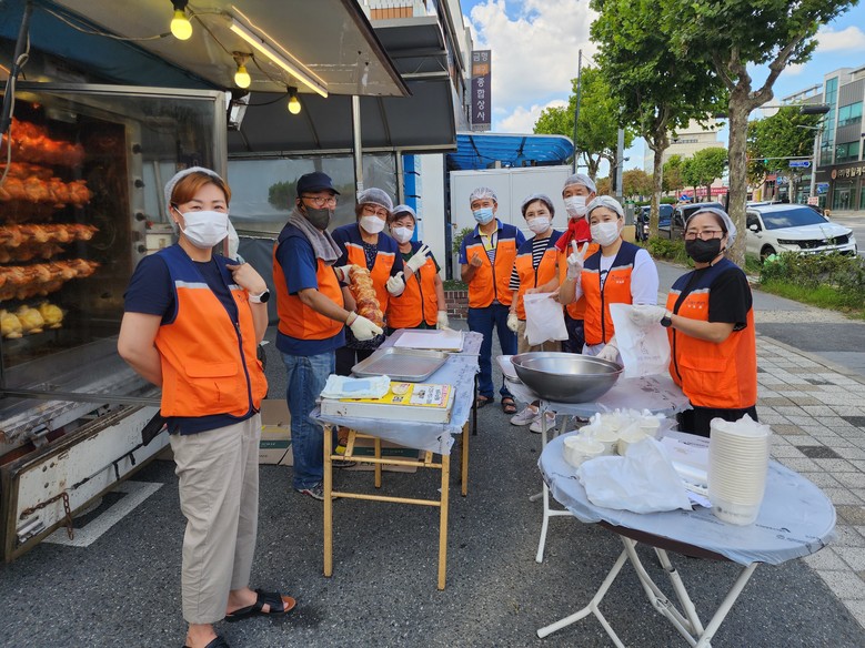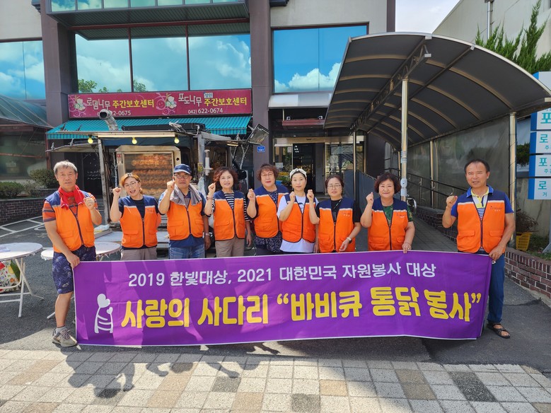 이날 봉사에는 신상일 단장을 비롯해서 10명의 봉사자들이 더운 날씨에도 오후1시~오후 3시까지 바비큐 통닭 봉사를 하였다.