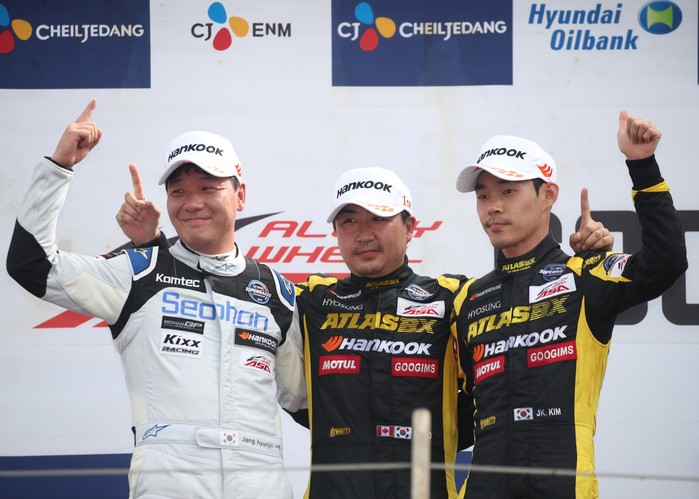 [사진설명] 드라이버 포인트 1위와 3위인 아트라스BX 모터스포츠의 김종겸과 조항우, 4위인 서한 GP의 장현진(오른쪽부터)이 KIC에서 열렸던 지난 3라운드 경기에서 나란히 포디움에 올라 포즈를 취하고 있다.