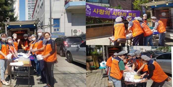 [세계타임즈 이장성 기자] 다양한 봉사를 꾸준히 실천하고 있는 SNS 대전시 봉사단체 사랑의 사다리 밴드(리더 이정제)는 7일 오후3시, 중구 용두동에 위치한 대전시농아인협회 중구지부(지회장 천수진)에서 바비큐 통닭 40마리 봉사로 우리 사회의 따뜻한 사랑을 전달 하였다.