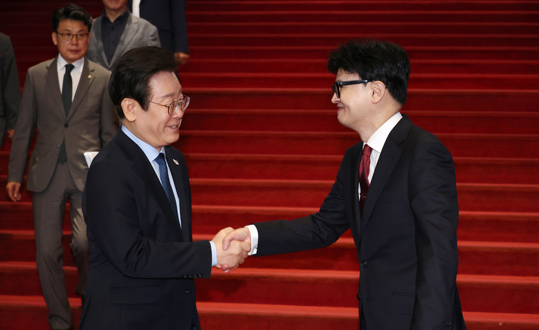 국민의힘 한동훈 대표와 더불어민주당 이재명 대표가 1일 오후 국회에서 열린 채상병 특검법, 금융투자소득세 폐지, 전 국민 25만원 지원법 등을 논의하는 여야 대표 회담에 앞서 기념 촬영을 하고 있다.