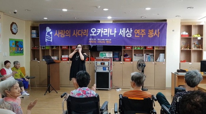 오카리나 고민정 회장은 “오카리나 연주에 박수를 치시면서 즐거워하시는 어르신들의 모습에서 행복과 보람을 느낀다.“고 말했다.