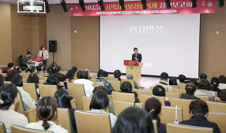 [중구 세계타임즈=심하린 기자] 인천시 중구(구청장 김정헌)는 지난 23일 영종복합문화센터 문화복지동 대강당에서 김정헌 중구청장, 중구의회 의원, 협의체 위원 등 110여 명이 참석한 가운데, ‘2025년 지역사회보장협의체 성과보고회’를 개최했다.