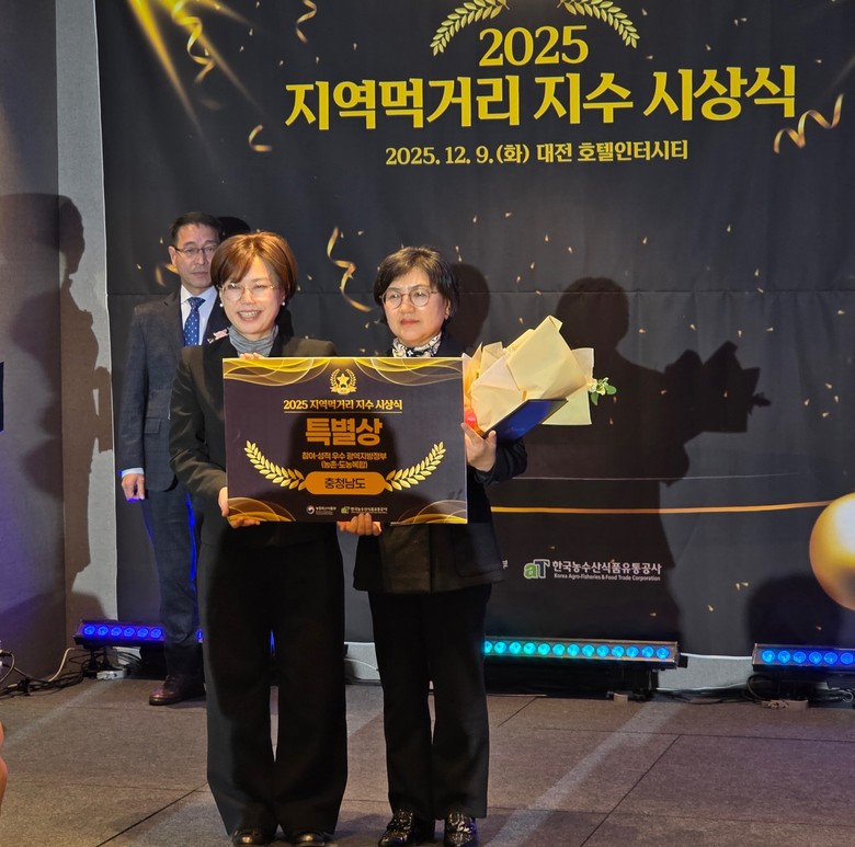 충청남도는 9일 오후 2시 대전시 인터시티호텔에서 개최된 ‘2025년 지역먹거리지수’ 시상식에서 ‘우수 광역지방정부’로 선정되어 특별상(농림축산식품부장관상)을 수상했다.