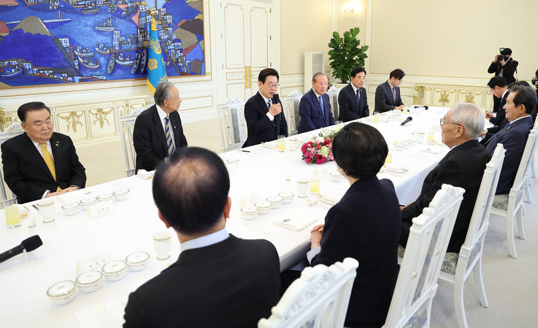 [세계타임즈 = 이채봉 기자] 이재명 대통령은 25일 청와대로 더불어민주당 상임고문단을 초청해 오찬을 함께 하며 국정 운영에 대한 조언을 청취했다.이날 청와대 본관에서 열린 오찬 간담회에는 민주당 권노갑·이용득 상임고문, 한명숙·정세균 전 국무총리, 김원기·임채정·문희상·김진표·박병석 전 국회의장, 정동영 통일부 장관 등 당 원로들이 참석했다.