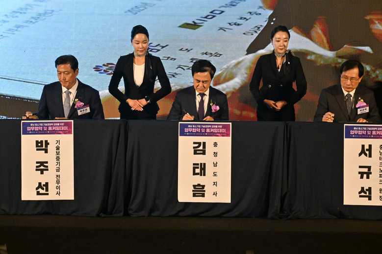 이날 도는 기술보증기금(이하 기보)·충남테크노파크(이하 충남TP)와 함께 중소기업의 연구개발(R&D)부터 기술 이전·사업화에 이르는 전주기 지원체계 구축을 목표로 ‘충남 중소기업 기술 경쟁력 강화를 위한 업무협약’을 체결했다.