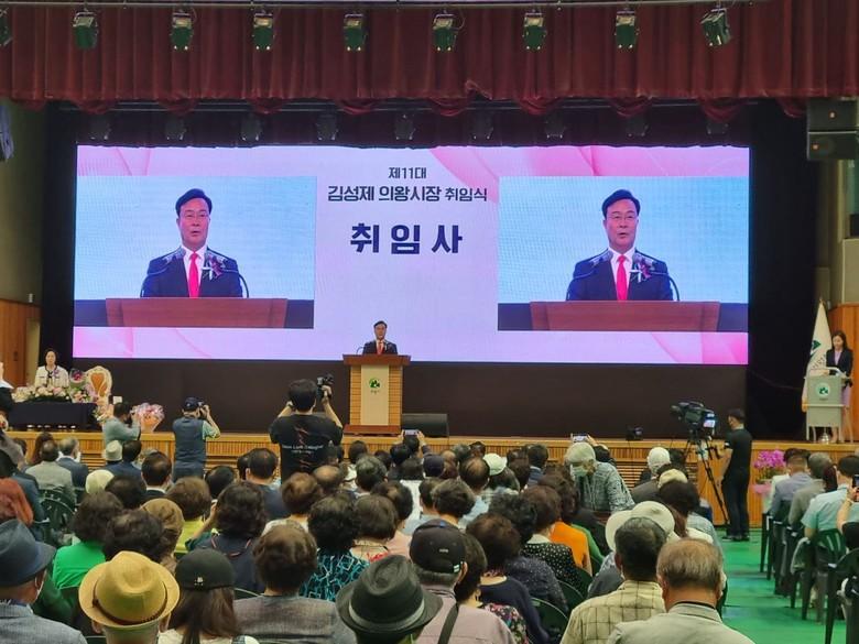 김성제 시장은 취임사를 통해 "800여 공직자와 함께 시민의 행복과 의왕시의 발전을 위해 최선을 다할 것이며 친환경 명품도시 그 새로운 도약의 시기에 새로운 10년을 선도하는 명품도시 의왕을 시민들과 함께 반드시 이뤄내겠다"고 말했다.