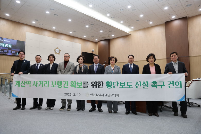 [계양구 세계타임즈=심하린 기자] 인천광역시 계양구의회 조양희 의원(더불어민주당, 다 선거구)이 대표 발의한 계산역 사거리 전방향 횡단보도 설치 촉구 건의안이 제264회 임시회 2차 본회의에서 채택됐다.