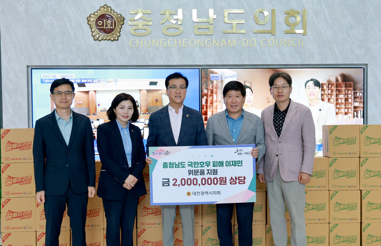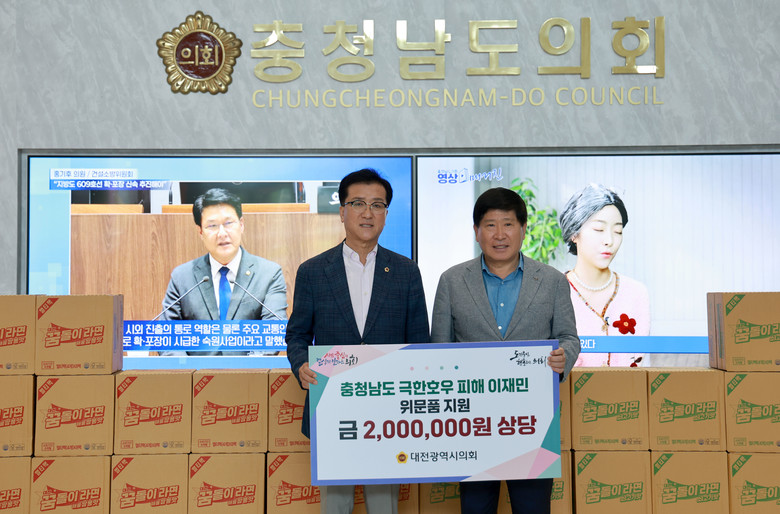 이번 전달식에는 조원휘 대전시의회 의장을 비롯해 홍성현 충청남도의회 의장 등 양 의회 주요 인사들이 참석했으며, 대전시의회가 위문품으로 전달한 꿈돌이라면 40박스(200만 원 상당)는 극한호우로 피해를 당한 주민들에게 지원될 예정이다.