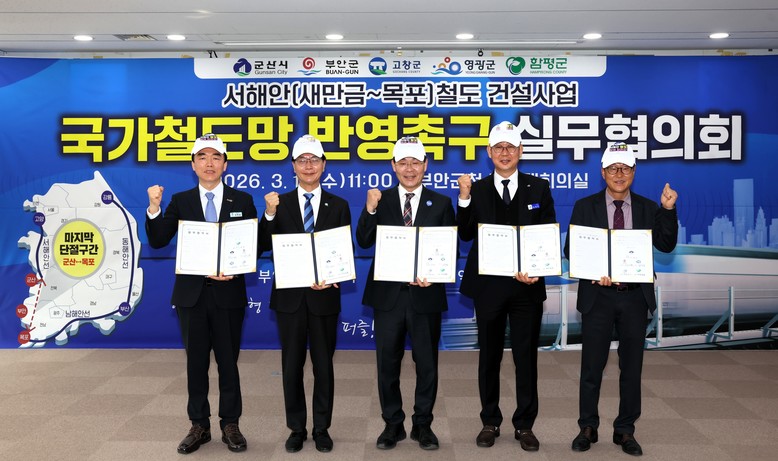 5개 시·군은 최근 부안군에서 「서해안 철도 건설사업 국가계획 반영 촉구를 위한 실무협의회」를 개최하고, 사업 추진을 위한 협력체계 구축과 공동 대응을 위한 협약을 체결했다고 밝혔다.