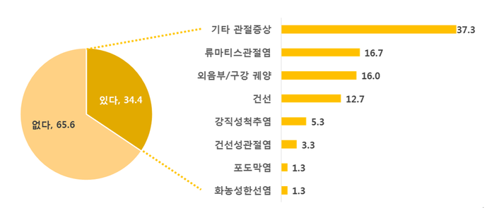 조사 결과, 염증성장질환 이외 전신성 동반질환이 있는 환자는 10명 중 3명 이상인34.4%에 달했다. 동반질환 혹은 증상으로는 관절 증상이 37.3%로 가장 높았고, 이어 류마티스관절염 16.7%, 외음부/구강 궤양 16%, 건선 12.7%, 강직성척추염 5.3% 순이었다.